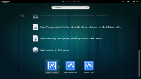 Leider gab die Shell-Erweiterung recht schnell ihren Geist auf. Ich meine, dass sie bereits mit einem Update auf GNOME 3.6 ihren Dienst quittierte und danach lange nicht aktualisiert wurde. Nun aber — gut schon seit zwei Monaten — funktioniert sie aber auch wieder mit GNOME 3.8 und neuer. Wer VirtualBox auf seinem Rechner hat und die GNOME Shell nutzt, der muss nur die Erweiterung aktivieren. Die VM sollten dann umgehend in der Aktivitäten-Übersicht erscheinen.