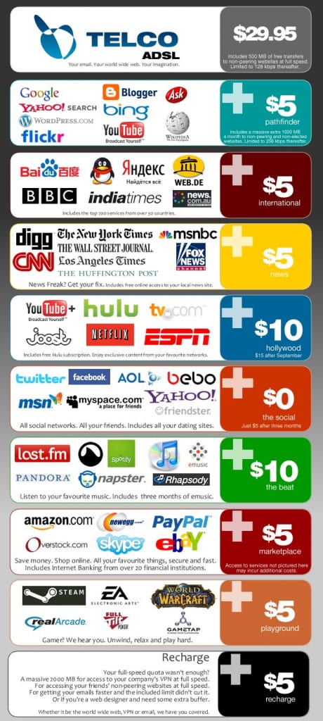 Netzneutralität ist ein sperriger Begriff, unter dem sich Laien wenig vorstellen können. Im Netz habe ich eine gute Darstellung gefunden, die das „Was wäre wenn es keine Netzneutralität gäbe“ Szenario aus der „Kundenperspektive“ gut beschreibt (via packetlife.net).