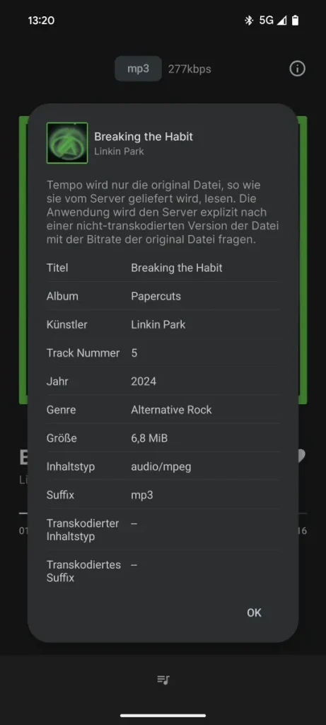 Tempo unterstützt (wenn euer Server das erlaubt) auch Transcoding. Gerade im Auto kann es sinnvoll sein, FLACs oder hochauflösende Formate als MP3 mit 192 oder 256 kbit/s zu streamen. Das spart (zumindest bei mir) begrenztes Datenvolumen und läuft auch bei wackliger Verbindung stabil. Die entsprechenden Einstellungen findet ihr in den Settings von Tempo. In meinem Fall musste ich innerhalb von Navidrome das Transcoding nicht gesondert konfigurieren.