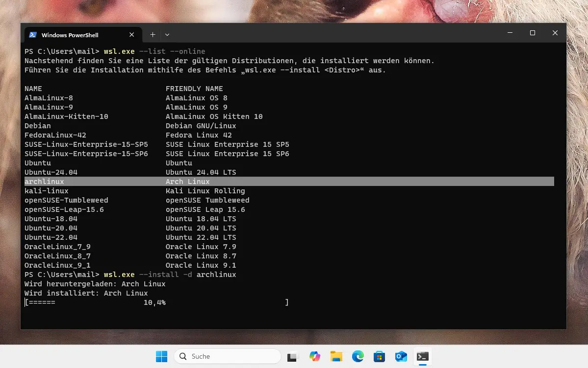 Bisher war Arch Linux in WSL nur über Umwege verfügbar. Wer wollte, konnte sich ein inoffizielles Image holen oder mit etwas Aufwand selbst eines erzeugen. Das ändert sich nun: Seit dem 15. April ist Arch Linux ganz offiziell in Microsofts WSL-Verzeichnis gelistet. Der Befehl wsl.exe --list --online zeigt euch alle verfügbaren Distributionen – darunter nun auch „archlinux“. Mit wsl.exe --install -d archlinux könnt ihr euch die schlanke Distribution direkt aus dem Microsoft Store installieren.