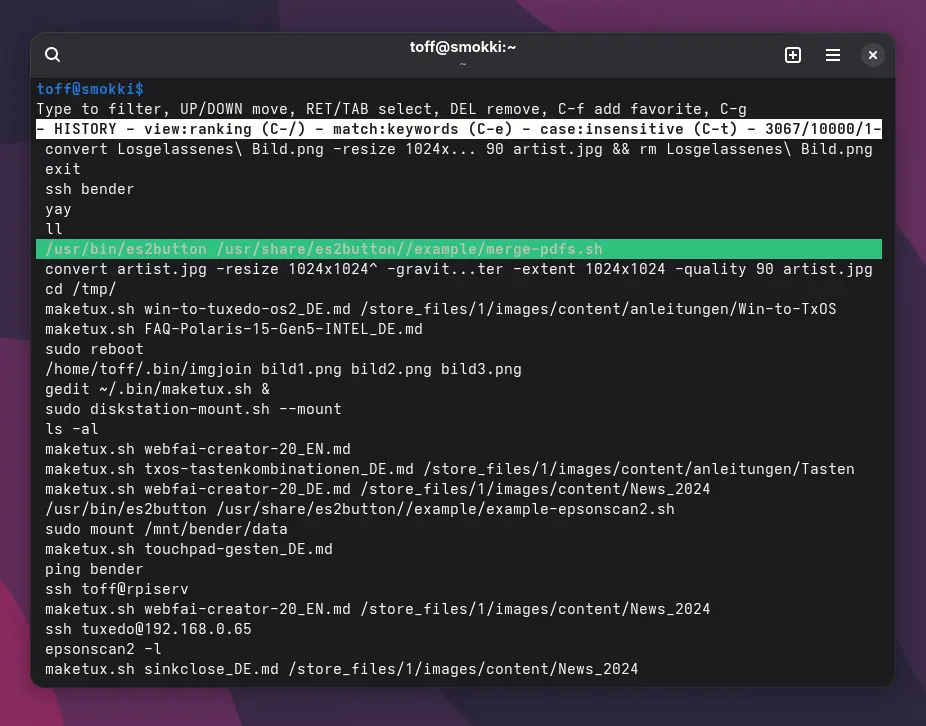 In der Übersicht navigiert ihr mit Hoch/Runter durch die Liste. Mit Links/Rechts oder Tabulator wird der markierte Eintrag übernommen und kann direkt bearbeitet werden. Beim Tippen filtert die Suggest Box die Liste dynamisch. Auch diese lässt sich dann weiter durchblättern. Wer einzelne Befehle dauerhaft aus der History entfernen möchte, drückt einfach Entf.