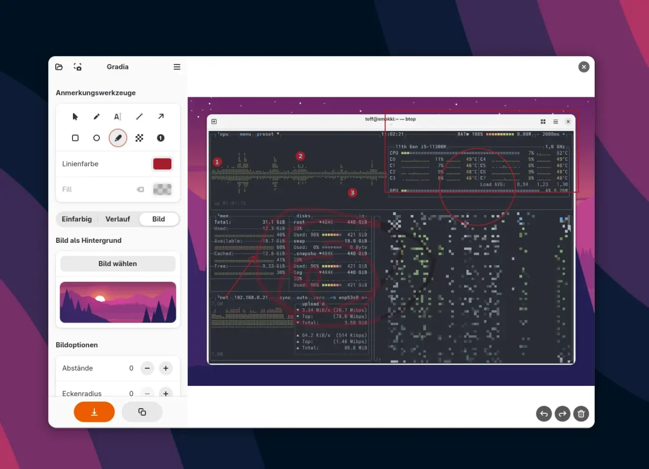 Mit Version 1.4 hat sich das grundlegend geändert. Gradia ist in riesigen Schritten jetzt ein vollwertiges Screenshot-Tool mit integrierten Bildbearbeitungsfunktionen geworden – ähnlich wie etwa Shutter oder Ksnip. Der große Unterschied: Gradia konzentriert sich nach wie vor darauf, aus schlichten Screenshots ansprechende Grafiken zu machen.