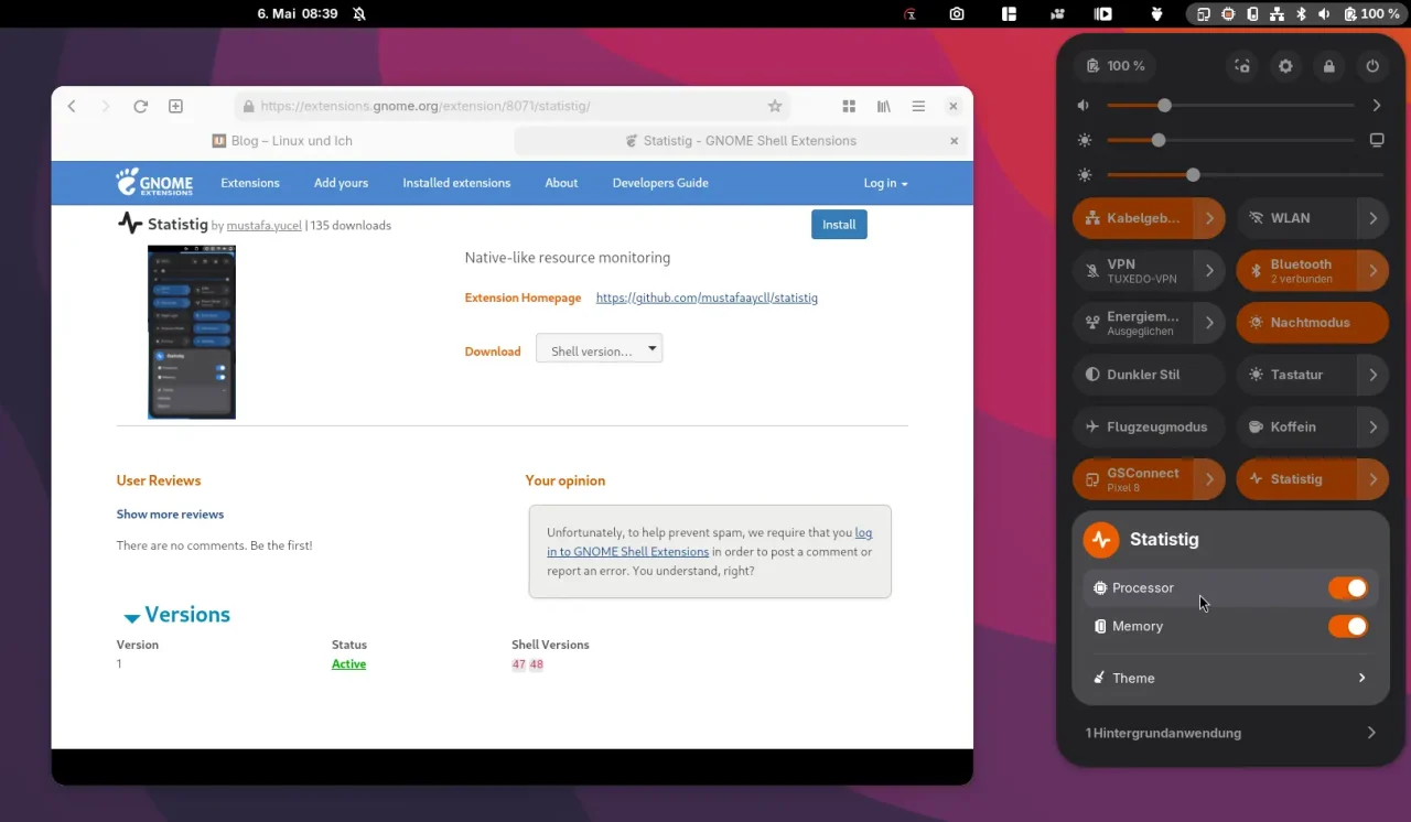 Das Design folgt den GNOME-Vorgaben und verzichtet bewusst auf grafischen Ballast. Ein kleiner Wermutstropfen: Statistig klinkt sich zusätzlich ins Systemmenü ein. Das wäre nicht nötig – Einstellungen lassen sich bequem über den Erweiterungsmanager vornehmen. Wirklich störend ist das nicht, aber es wirkt ein wenig überflüssig. Der Quellcode ist auf GitHub verfügbar.