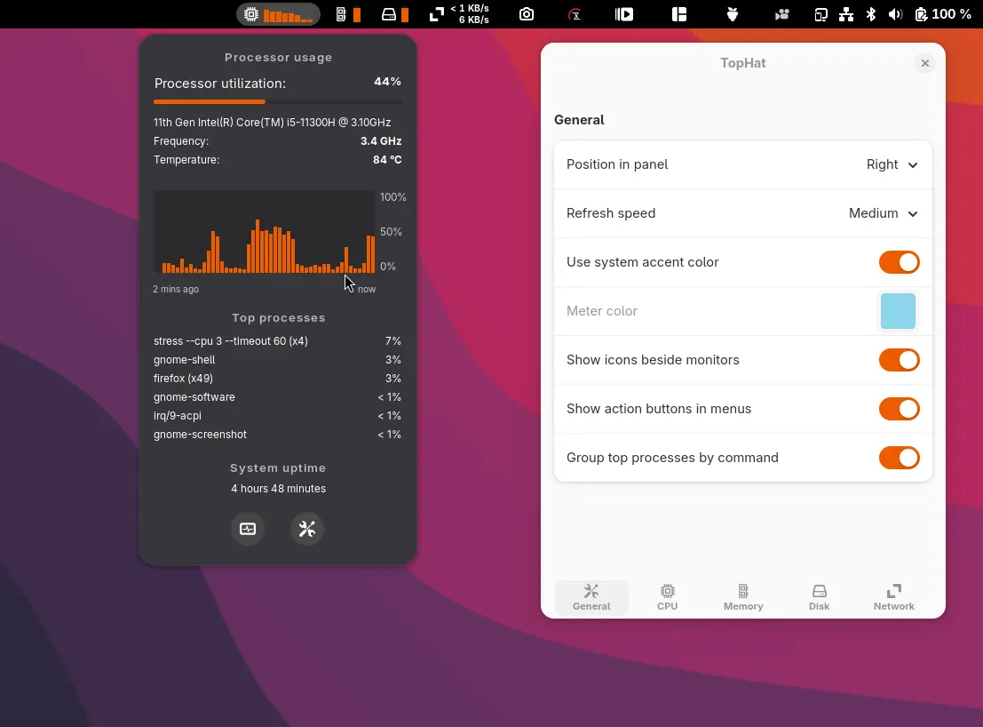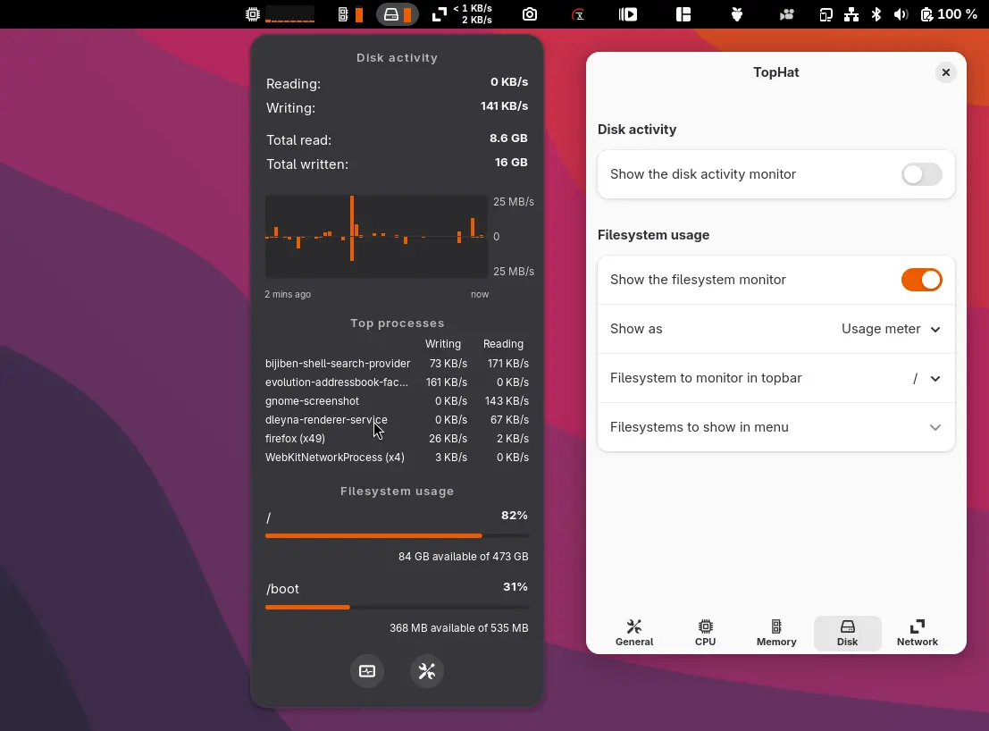 TopHat (Link geht zu den GNOME Extensions) richtet sich an alle, die etwas mehr Kontrolle und Transparenz schätzen. Die Erweiterung zeigt neben CPU- und RAM-Auslastung auch Netzwerk- und Festplattenaktivität – direkt oben in der GNOME-Leiste, mit kleinen animierten Graphen. Das Ganze bleibt übersichtlich, ohne den Desktop optisch zu überladen.