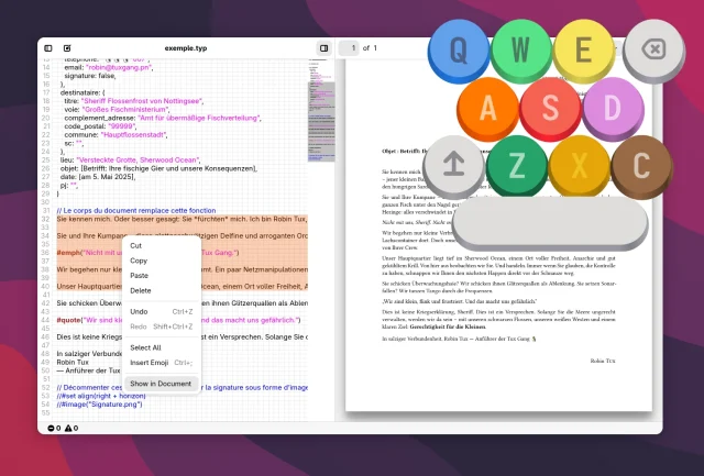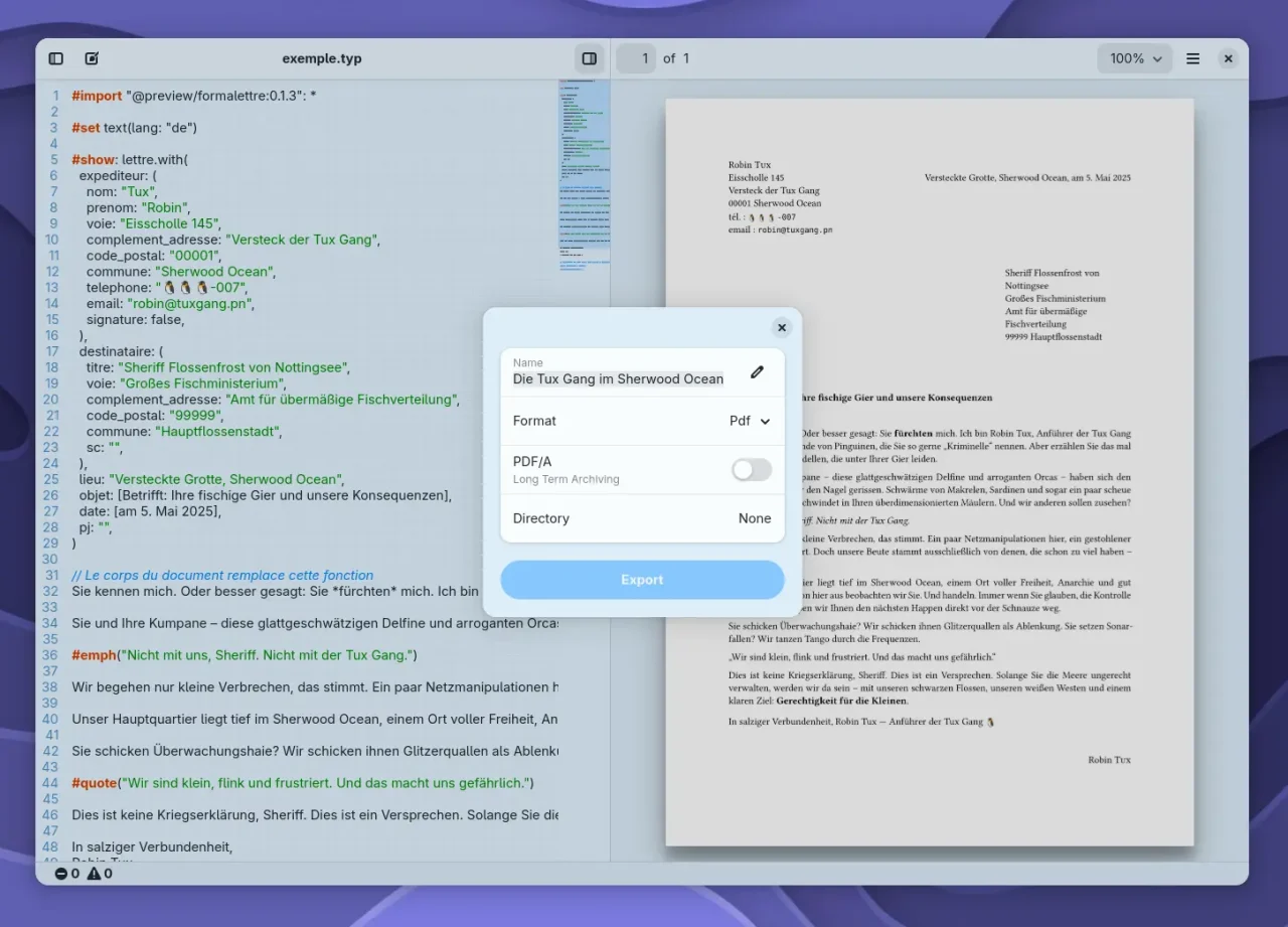 Fertige Dokumente könnt ihr schließlich in klassische Formate wie PDF, PNG oder SVG exportieren – ideal für Briefe, Bewerbungen oder wissenschaftliche Veröffentlichungen. Die Bedienung bleibt dabei stets intuitiv und auf das Wesentliche konzentriert. In meinen Augen geht das Tippen eines Briefs mit der Kombination aus Typewriter und Typst schneller, als mit meinem bislang genutzen Setup aus Setzer und LaTeX.