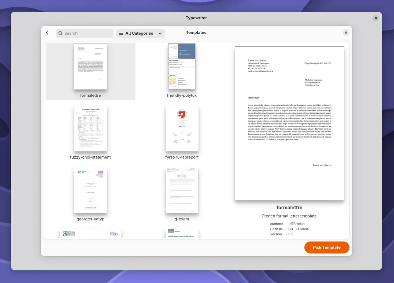 Ein weiteres Highlight von Typewriter ist die integrierte Template-Datenbank. Ihr könnt aus verschiedenen Vorlagen wählen – darunter Lebensläufe, Bewerbungsschreiben, wissenschaftliche Arbeiten oder einfache Briefe – und habt damit direkt ein sauberes Grundgerüst, das ihr nur noch anpassen müsst. Gerade für Einsteiger ist das ein großer Pluspunkt, weil man sich nicht mit grundlegenden Layoutfragen herumschlagen muss.