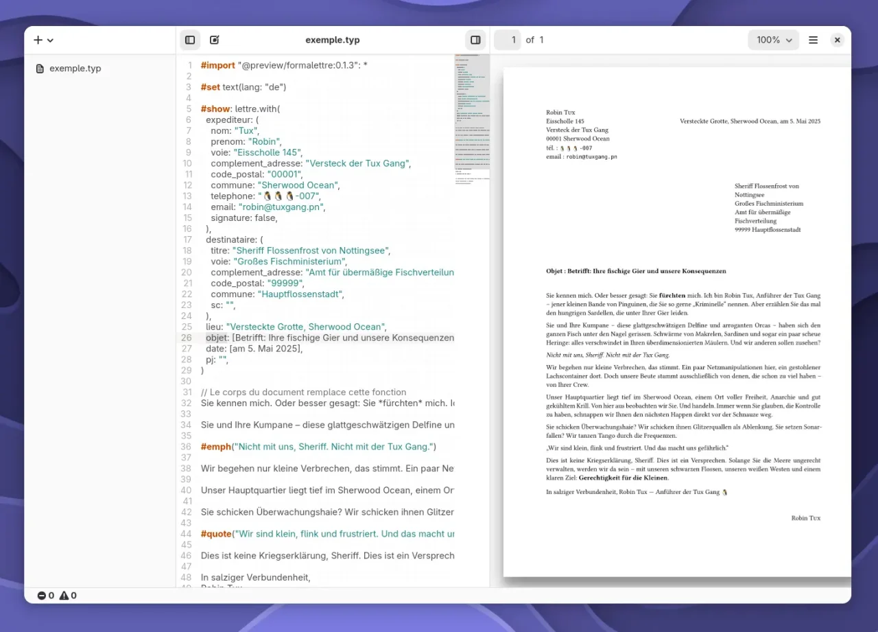 Typst ist mein neues Werkzeug der Wahl, wenn ich kurze Dokumente wie Briefe, Lebensläufe oder Bewerbungen schreibe. Lange Zeit habe ich dafür auf LaTeX gesetzt – aus guten Gründen: Ich habe die volle Kontrolle über das Layout, bin unabhängig von proprietären Office-Formaten und kann Inhalte und Stil sauber voneinander trennen. Der Einsatz von reinen Text-Formaten erleichtert zudem die Korrektur und das Übersetzen, auch mit Hilfe von KI-Tools.