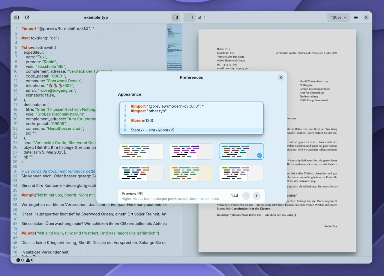 Der Editor wurde gezielt für GNOME entwickelt und setzt konsequent auf Libadwaita – optisch und funktional fügt er sich also nahtlos in ein modernes GNOME-Setup ein. Typewriter bietet eine Live-Vorschau eures Dokuments, wie ihr sie vielleicht schon von Markdown-Editoren wie Apostrophe kennt: Links schreibt ihr den Typst-Quelltext, rechts seht ihr in Echtzeit das Ergebnis. Das erleichtert den Einstieg enorm und macht den gesamten Workflow angenehmer.