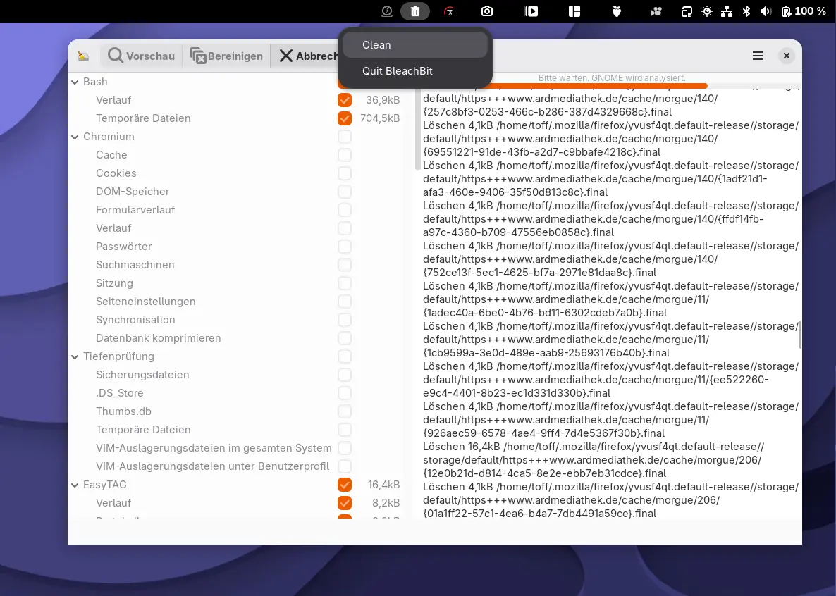 Linux-Anwender profitieren zusätzlich von einem neuen AppIndicator-Symbol, das im Panel von GNOME oder KDE anzeigt, wenn BleachBit aktiv ist. So lässt sich das laufende Programm auch dann erkennen, wenn es nicht in der Taskleiste sichtbar ist. Für Nutzer, die oft Daten vom System schrubben möchten, ist das sicher eine praktische Funktion.